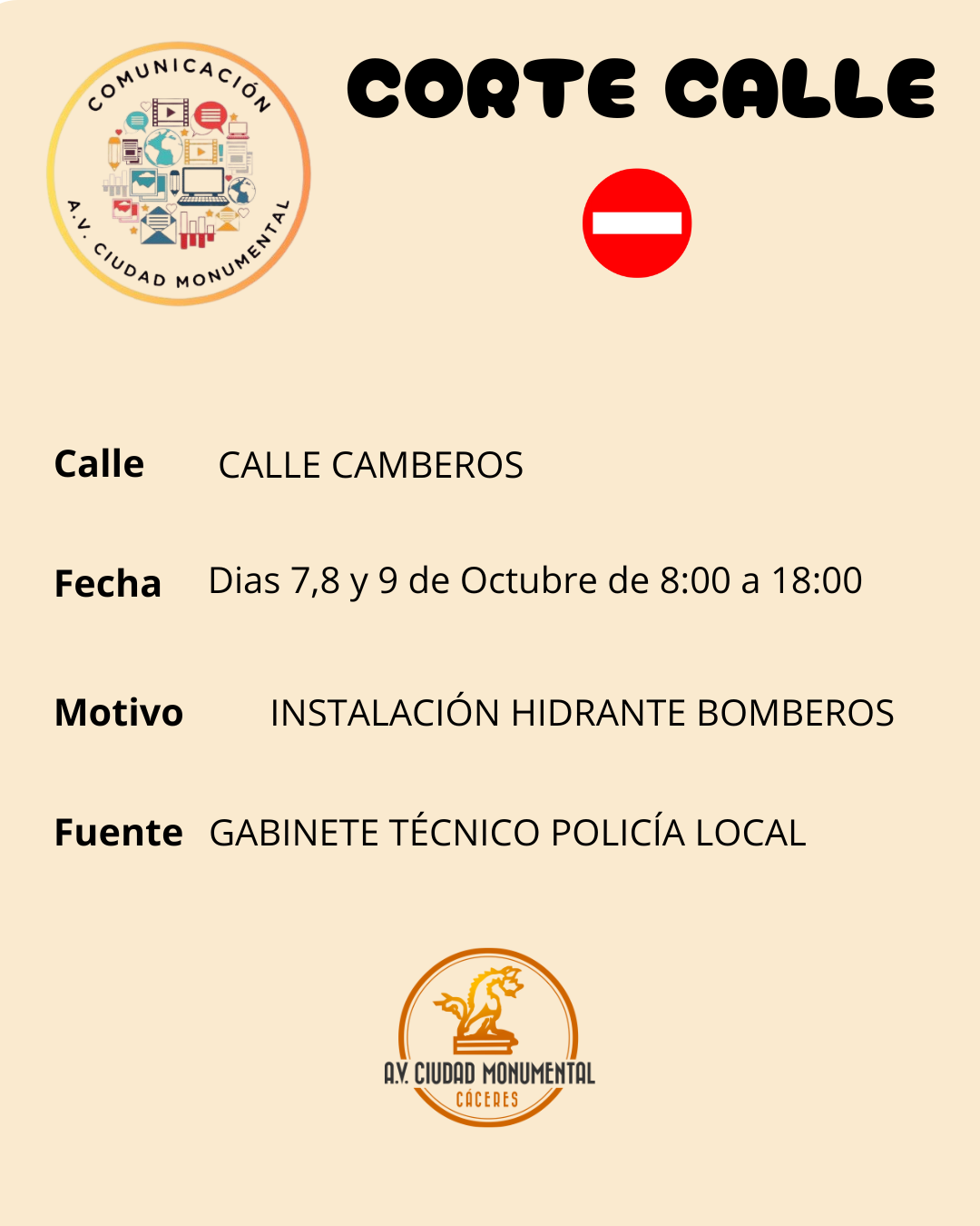 LOS DÍAS 6, 7 Y 8 OCTUBRE EN HORARIO DE 08:00H A 18:00H POR TRABAJOS PARA INSTALACIÓN DE HIDRANTE PARA BOMBEROS