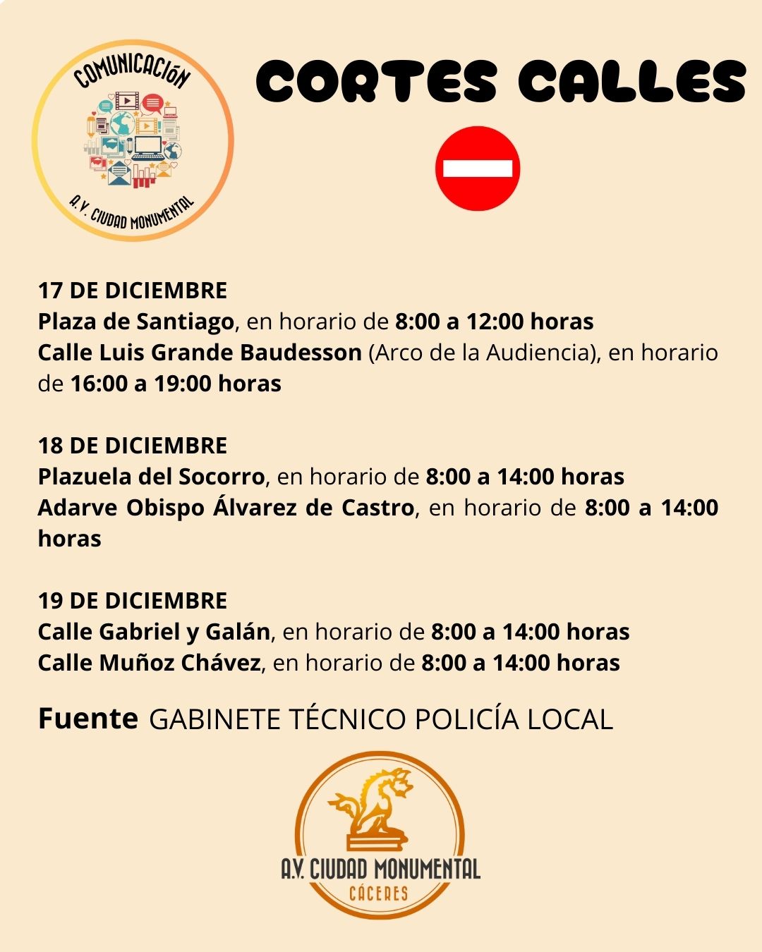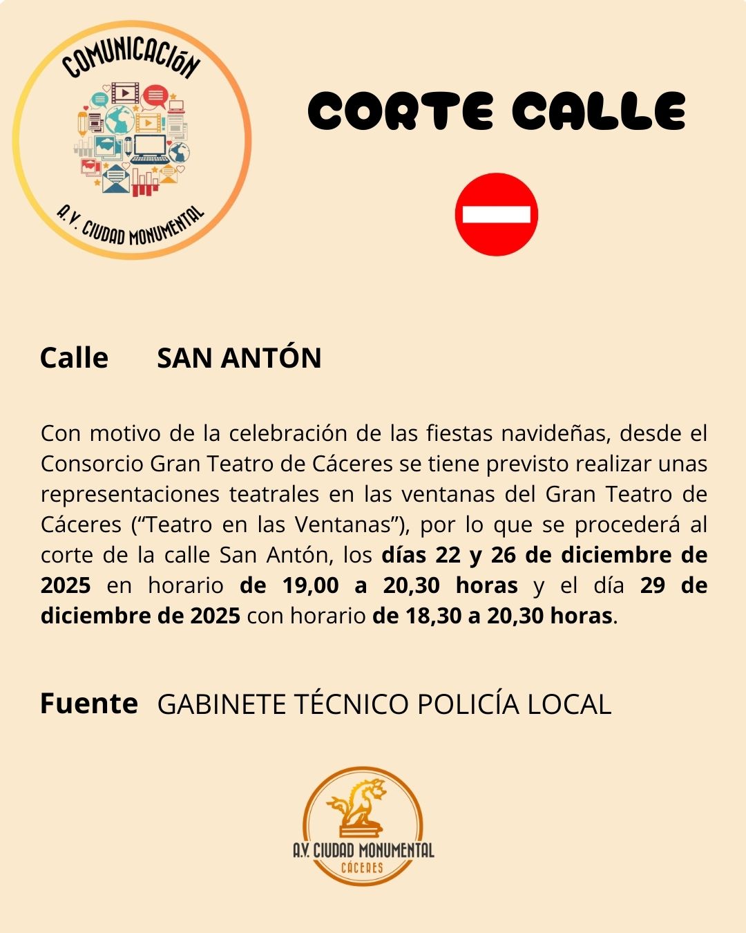 Con motivo de la celebración de las fiestas navideñas, desde el Consorcio Gran Teatro de Cáceres se tiene previsto realizar unas representaciones teatrales en las ventanas del Gran Teatro de Cáceres (“Teatro en las Ventanas”), por lo que se procederá al corte de la calle San Antón, los días 22 y 26 de diciembre de 2025 con horario de 19,00 a 20,30 horas y el día 29 de diciembre de 2025 con horario de 18,30 a 20,30 horas.