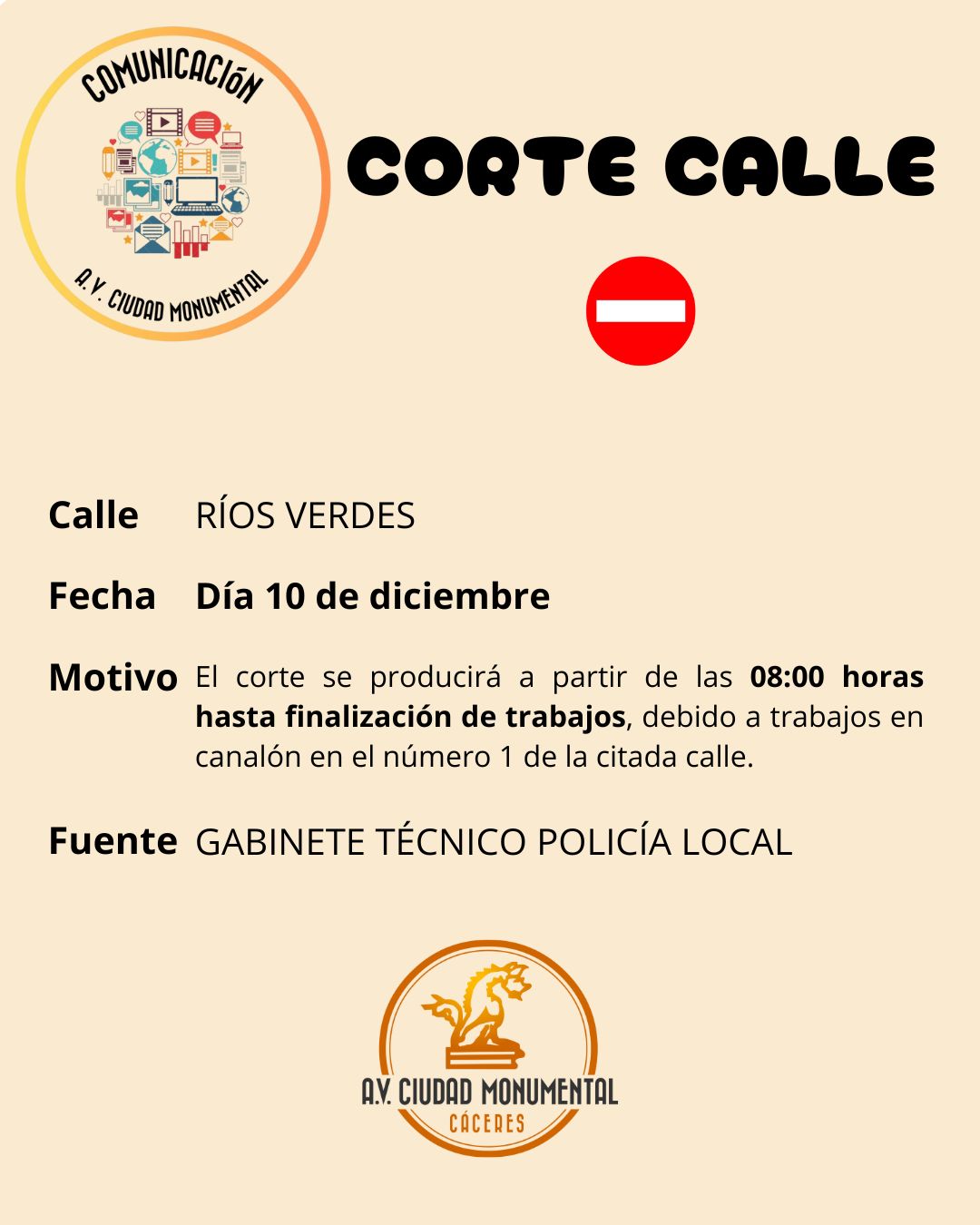 Igualmente, se procederá entre las 08:00 y las 16:00 horas al corte de la calle Ríos Verdes, para arreglo de balcones.