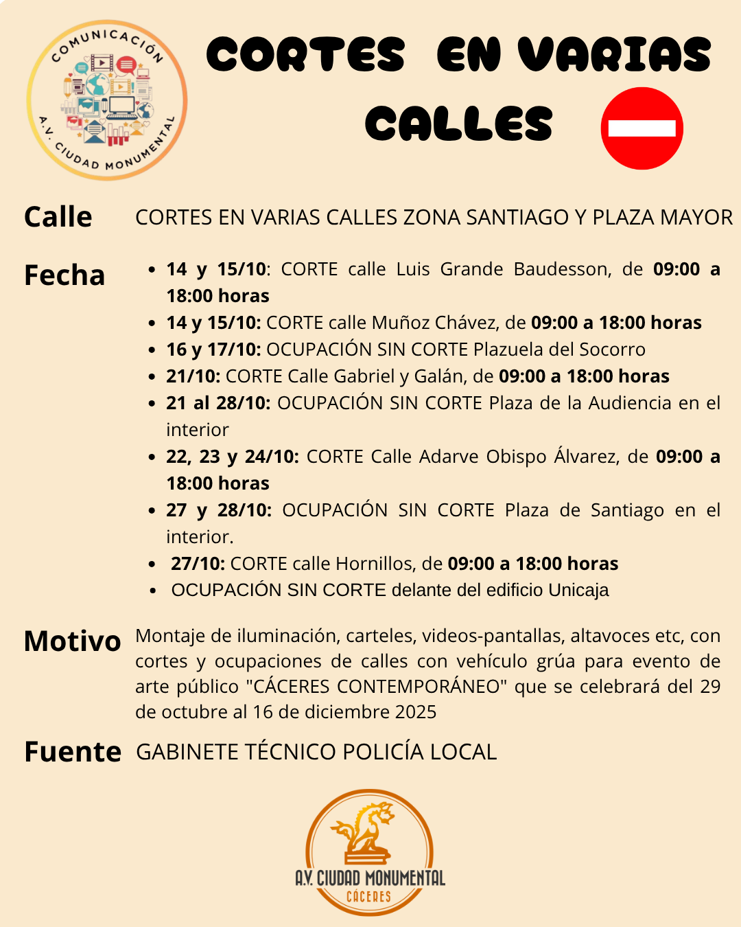 Montaje de iluminación, carteles, videos-pantallas, altavoces etc, con cortes y ocupaciones de calles con vehículo grúa para evento de arte público "CÁCERES CONTEMPORÁNEO" que se celebrará del 29 de octubre al 16 de diciembre 2025. -
