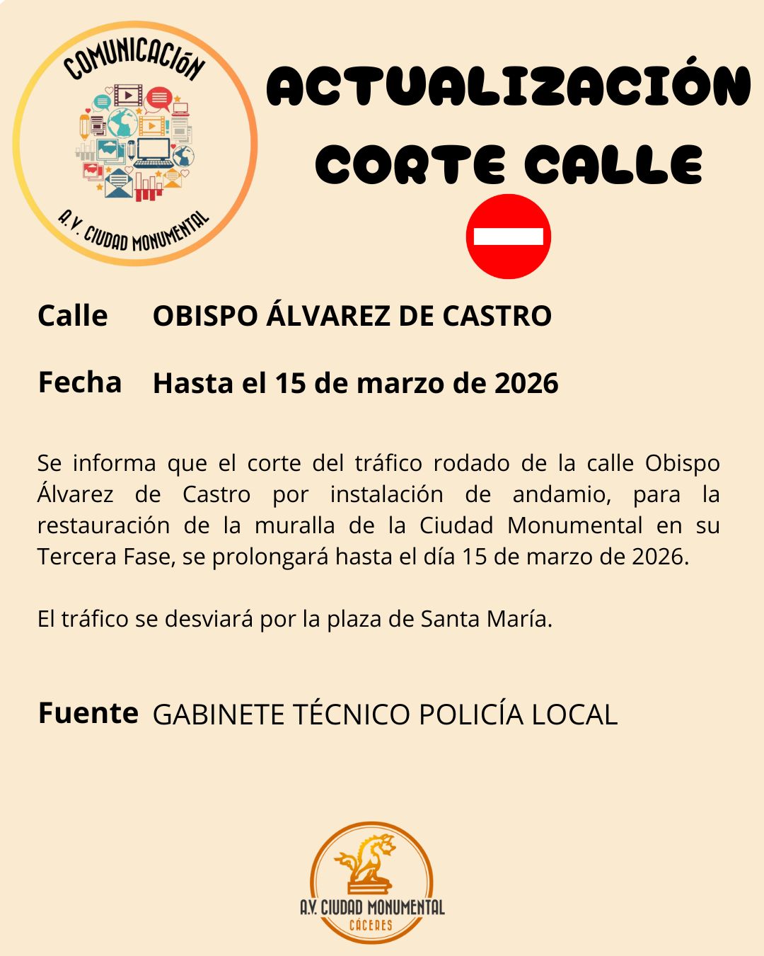 Se informa que el corte del tráfico rodado de la calle Obispo Álvarez de Castro por instalación de andamio, para la restauración de la muralla de la Ciudad Monumental en su Tercera Fase, se prolongará hasta el día 15 de marzo de 2026.