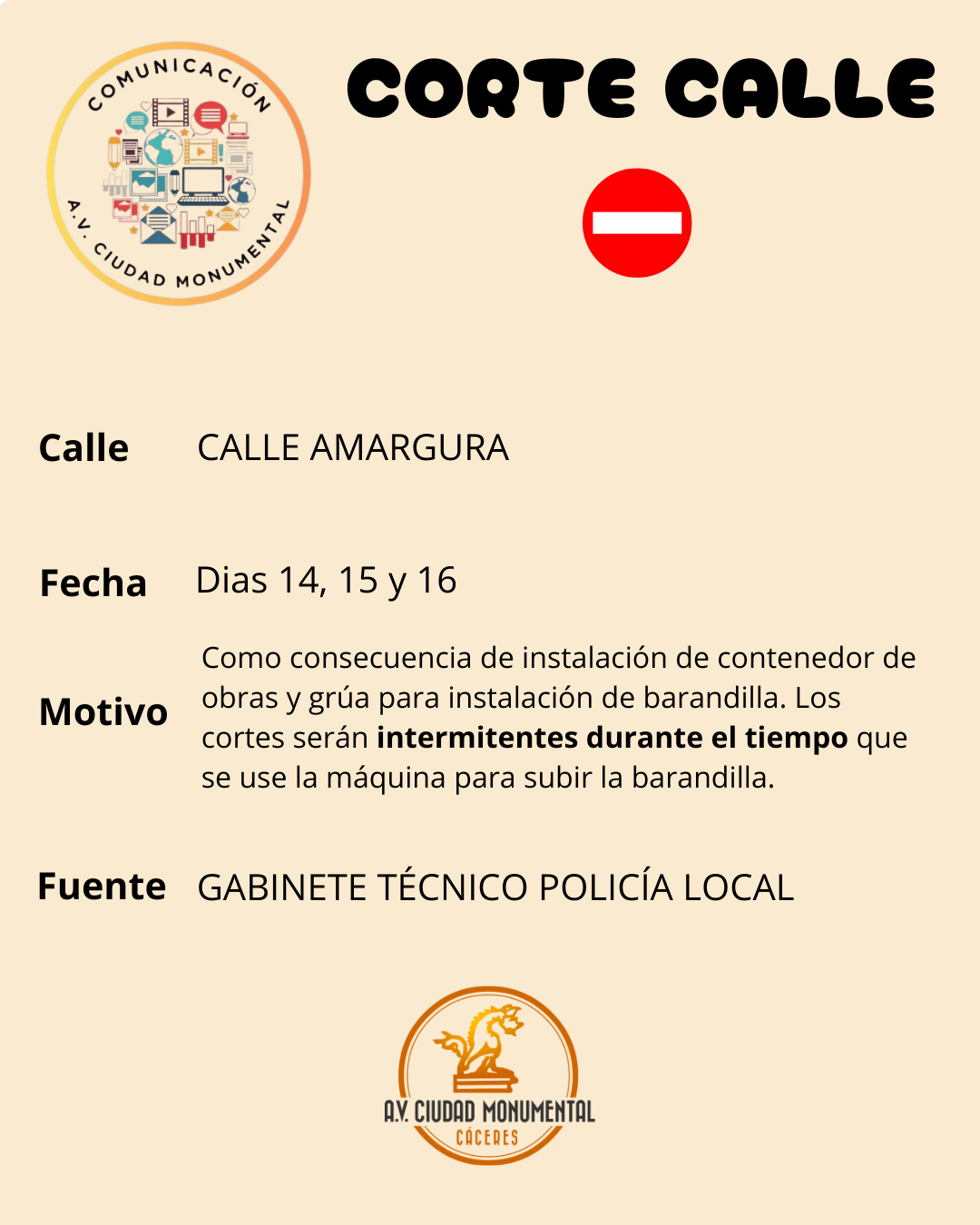 Se informa de corte previsto para los días 14, 15 y 16 de octubre en la calle Amargura como consecuencia de instalación de contenedor de obras y grúa para instalación de barandilla.